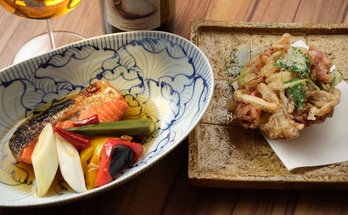 ルカツィテリのオレンジワインには天ぷらなど、香ばしさのある揚げ物が非常に好相性です。鮭の場合も焼いてから南蛮漬けにすることで複雑な風味と酸を同調させています。
