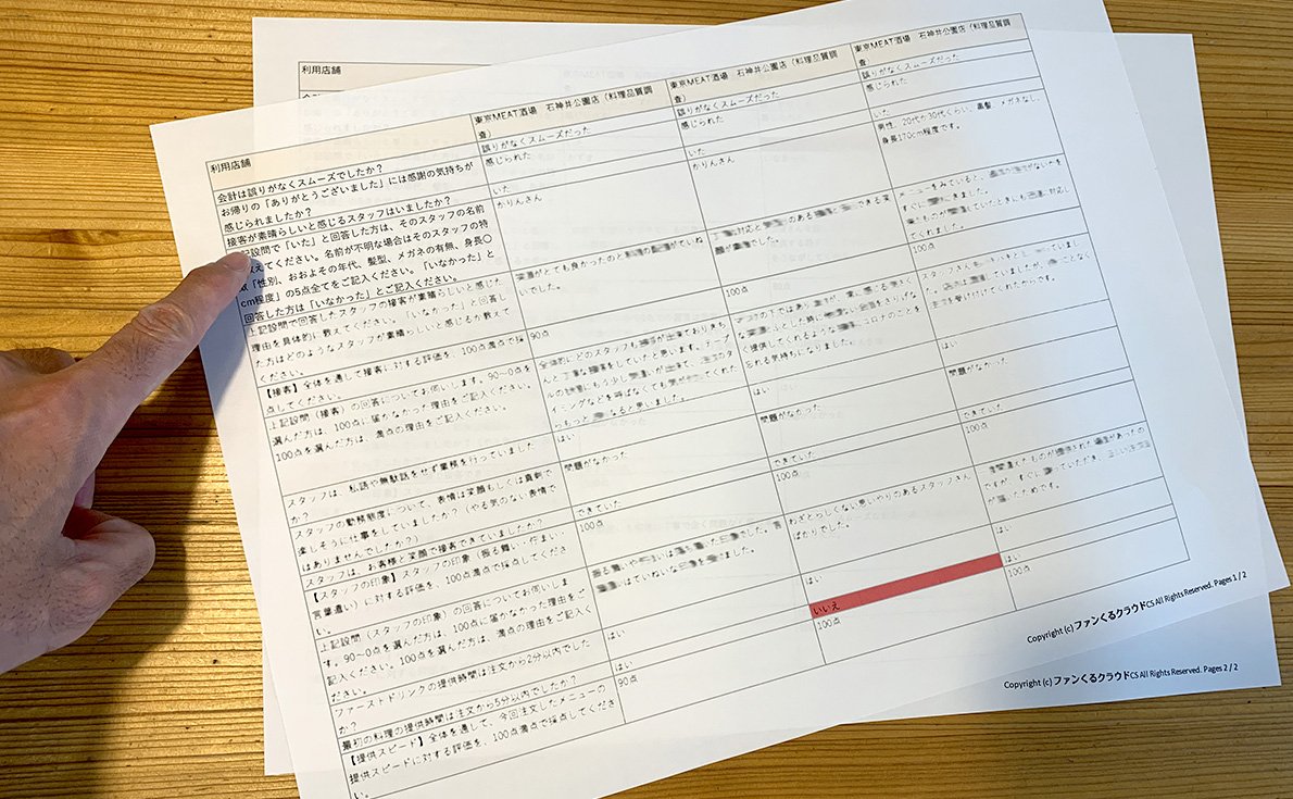 「ファンくる」の調査項目は79項目!自由記述の項目も20近くあります。さすがに全項目は紹介しきれないので飲食店の実力をみる基準となるQSCA(※)を中心に再構成しました。コメントは覆面調査レポートを一部加工してまとめたものです。