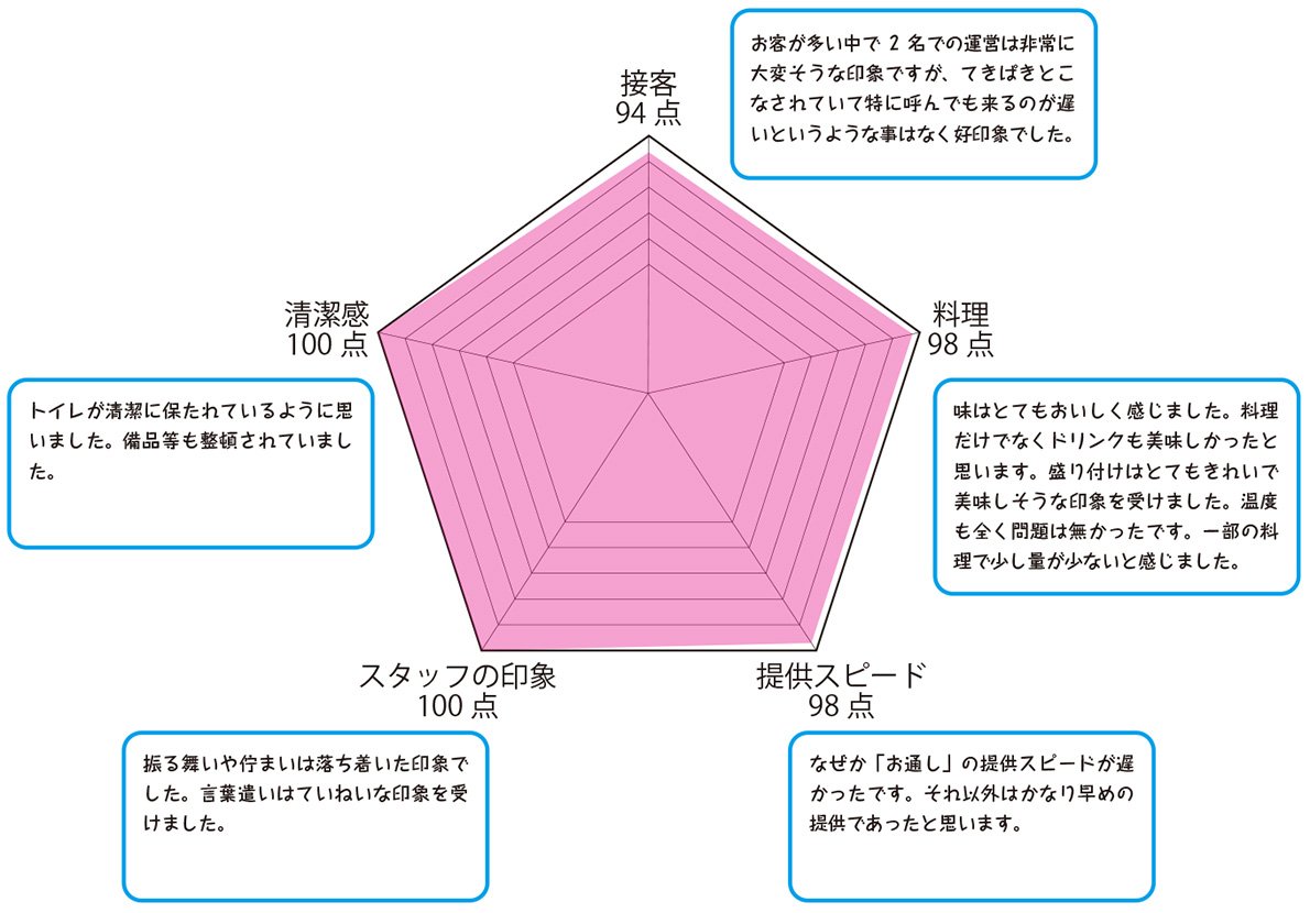 もちろん「飲食内容(料理)」のコメントも欠かさず確認する項目ですね。覆面調査だからこそ、いいところも悪いところもハッキリ書かれているのでとても刺激になっています。経験の浅い調理スタッフがキッチンに入る時間帯は、僕が提供前に必ずチェックできる配置をとり、盛り付けなどに不備があったらすぐに作り直させるように心がけています。